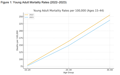 Figure 1. Young Adult Mortality Rates per 100,000 (Ages 15–44, 2022 vs. 2023)