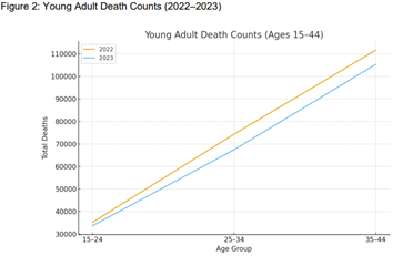 Figure 2. Young Adult Death Counts (Ages 15–44, 2022 vs. 2023)